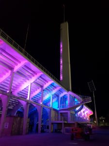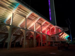 La valorizzazione del complesso architettonico è stata realizzata mediante l’utilizzo di 80 proiettori LED con colorazione RGB, con controllo tipo DMX, installati sulle travi del sottotribuna, orientati verso di essa, che realizzano mediante illuminazione indiretta l’illuminazione degli anelli in caso di eventi sportivi particolari.