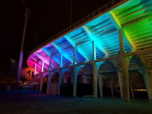 In aggiunta ai corpi illuminanti a luce bianca sono stati utilizzati 80 proiettori led RGB con controllo DMX, così da creare, in occasione di eventi sportivi e manifestazioni particolari, differenti scenari con diverse colorazioni.